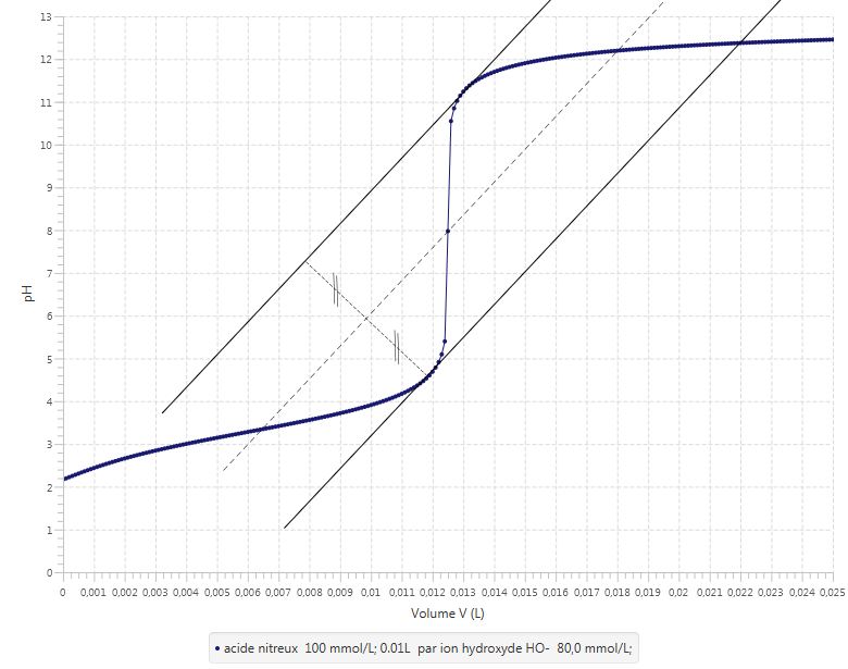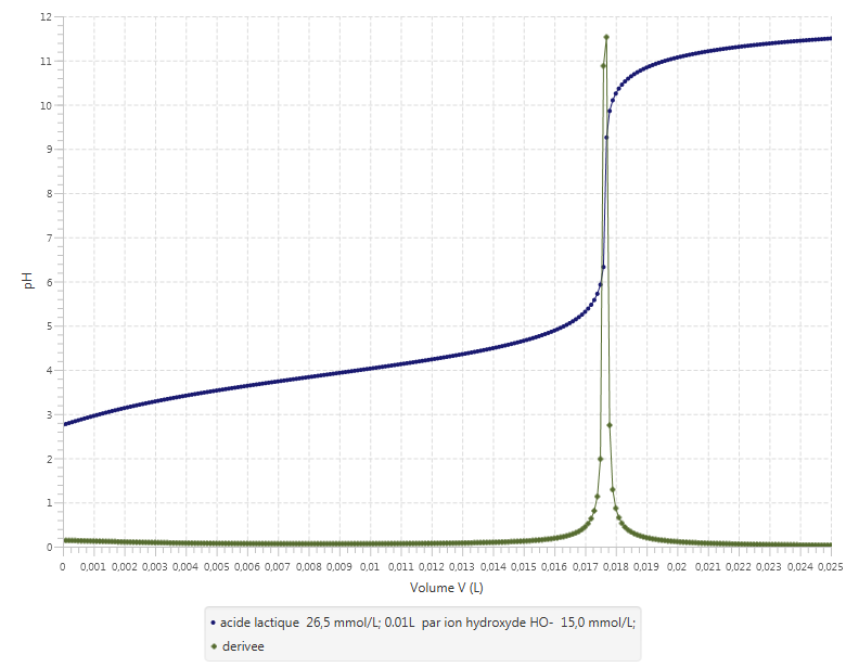 La dérivée (en vert sur le graphe ci-dessous) passe par un extrémum pour V=Véq. Source:logiciel LaboAB