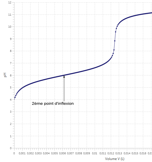 Lorsque ce second point d'inflexion existe, son abscisse est proche de Véq/2 et son ordonnée du pKa du couple.
